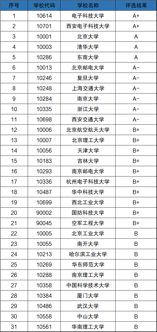 目前教育部门没有发布权威的集成电路设计专业大学排名,不过公布了电子科学与技术学科院校排名情况,而集成电路设计刚好是属于电子信息类,因此可将教育部第四轮学科评估——电子科学与技术学科排名情况作为参考,由于篇幅有限,小编仅整理出了A类和B类(不包括B-)高校,具体如下: