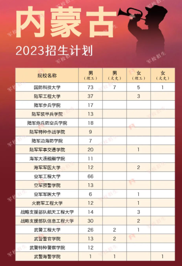 2023年内蒙古一共有20所军队院校招生,包含国防科技大学、陆军工程大学、陆军炮兵防空兵学院、陆军边海防学院等。