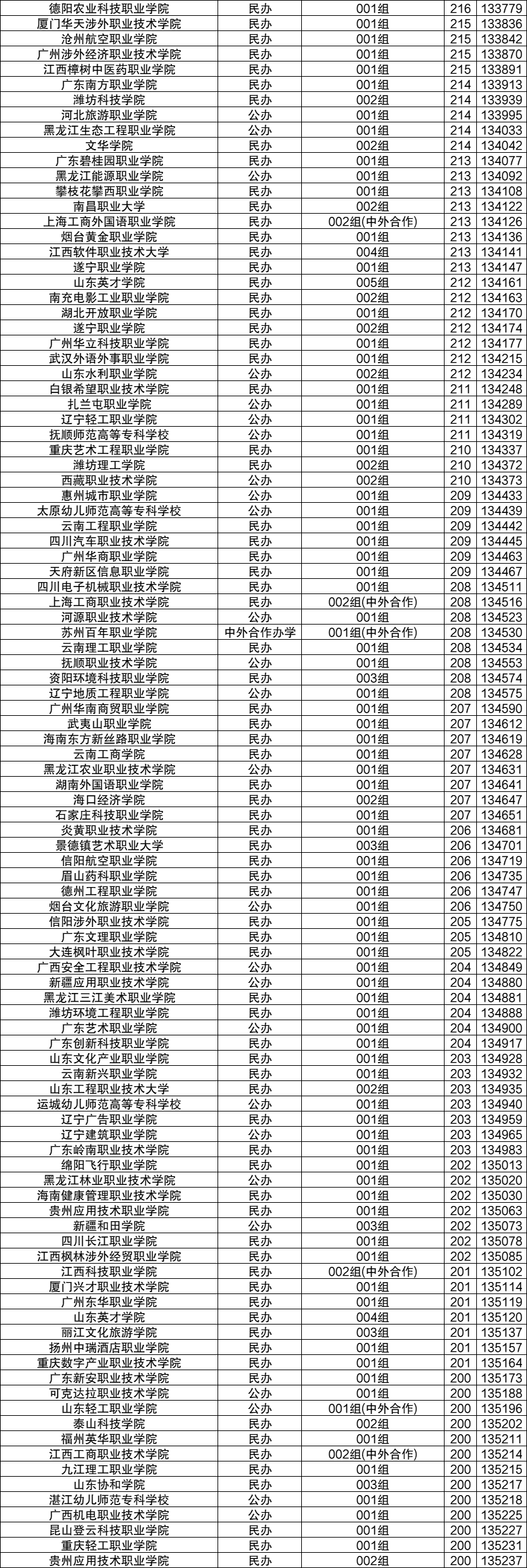 在安徽压专科线录取的有13个大学专业组,全部为省内大学,如:重庆轻工职业学院001组、广西机电职业技术学院001组、山东协和学院003组、湛江幼儿师范专科学校001组等,这些学校2024年高考录取最低分数均为200分,位次排在13.5万名左右能上。