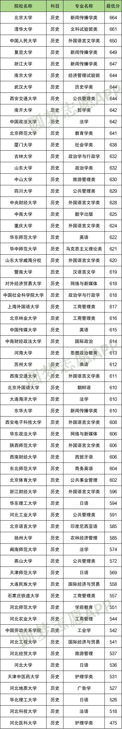 2024年在河北招收历史类考生的国家专项计划大学有62所,录取分数最低的院校是河北医科大学475分,对应专业为护理学类;录取分数最高的院校是北京大学664分,对应专业为新闻传播学类。