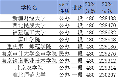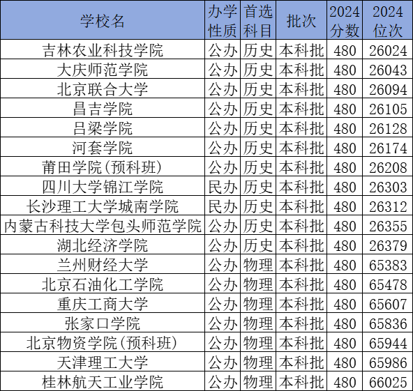 历史类480分能上的有吉林农业科技学院、大庆师范学院、北京联合大学、昌吉学院、吕梁学院等;物理类480分能上的有兰州财经大学、北京石油化工学院、重庆工商大学、张家口学院、北京物资学院(预科班)等。
