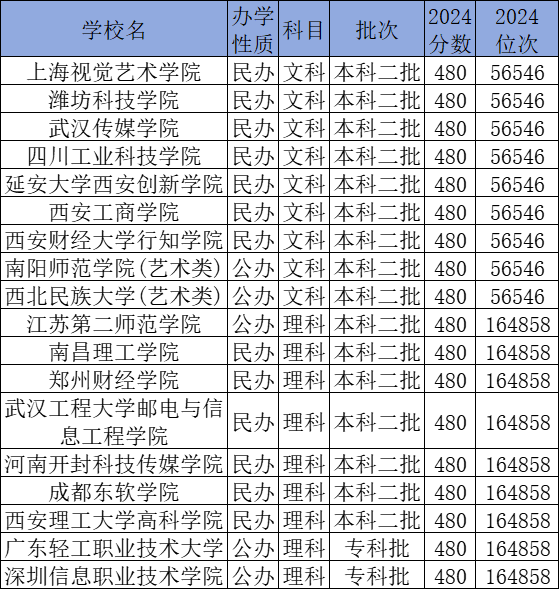 文科480分能上的大学有上海视觉艺术学院、潍坊科技学院、武汉传媒学院等;理科480分能上的大学有江苏第二师范学院、南昌理工学院、郑州财经学院、武汉工程大学邮电与信息工程学院等。