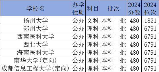 文科480分能上的大学有扬州大学;理科480分能上的大学有郑州大学、西南医科大学、西北大学等。