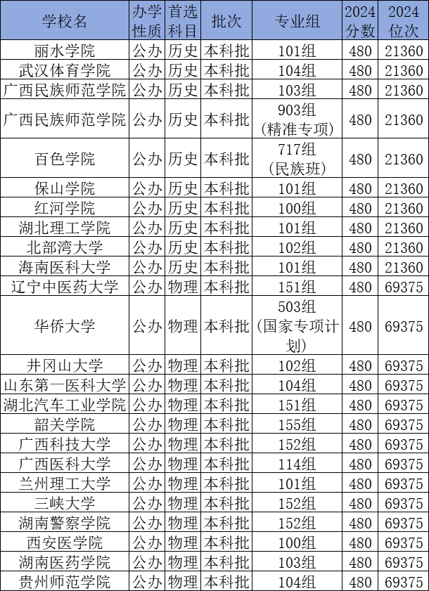 2024年广西480分对应排名:历史类21360名,物理类69375名。由于录取分数线波动较大,因此建议2025年高考位次排名在2.1万名或6.9万名左右的同学报考下表中的学校。