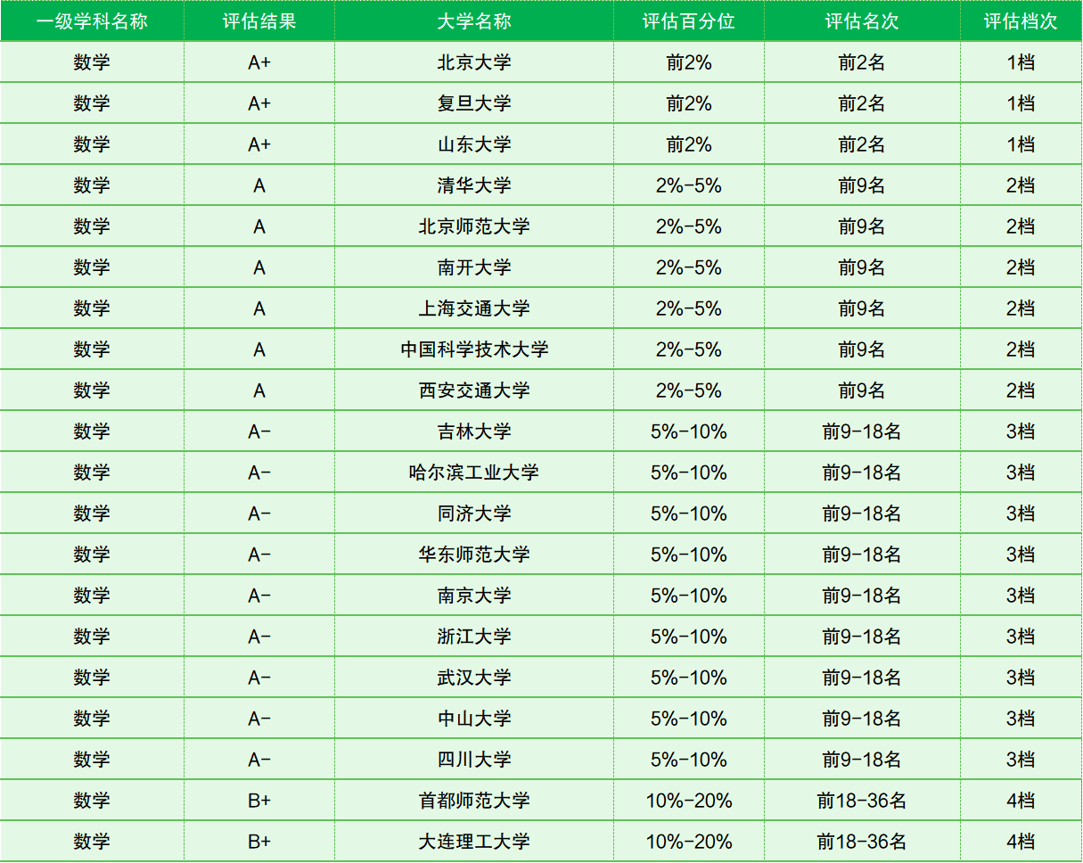 在全国第四轮数学学科评估排名中,北京大学、复旦大学以及山东大学的数学学科排在全国前2%(前2名),均属于双一流建设学科,评估等级为A+级。