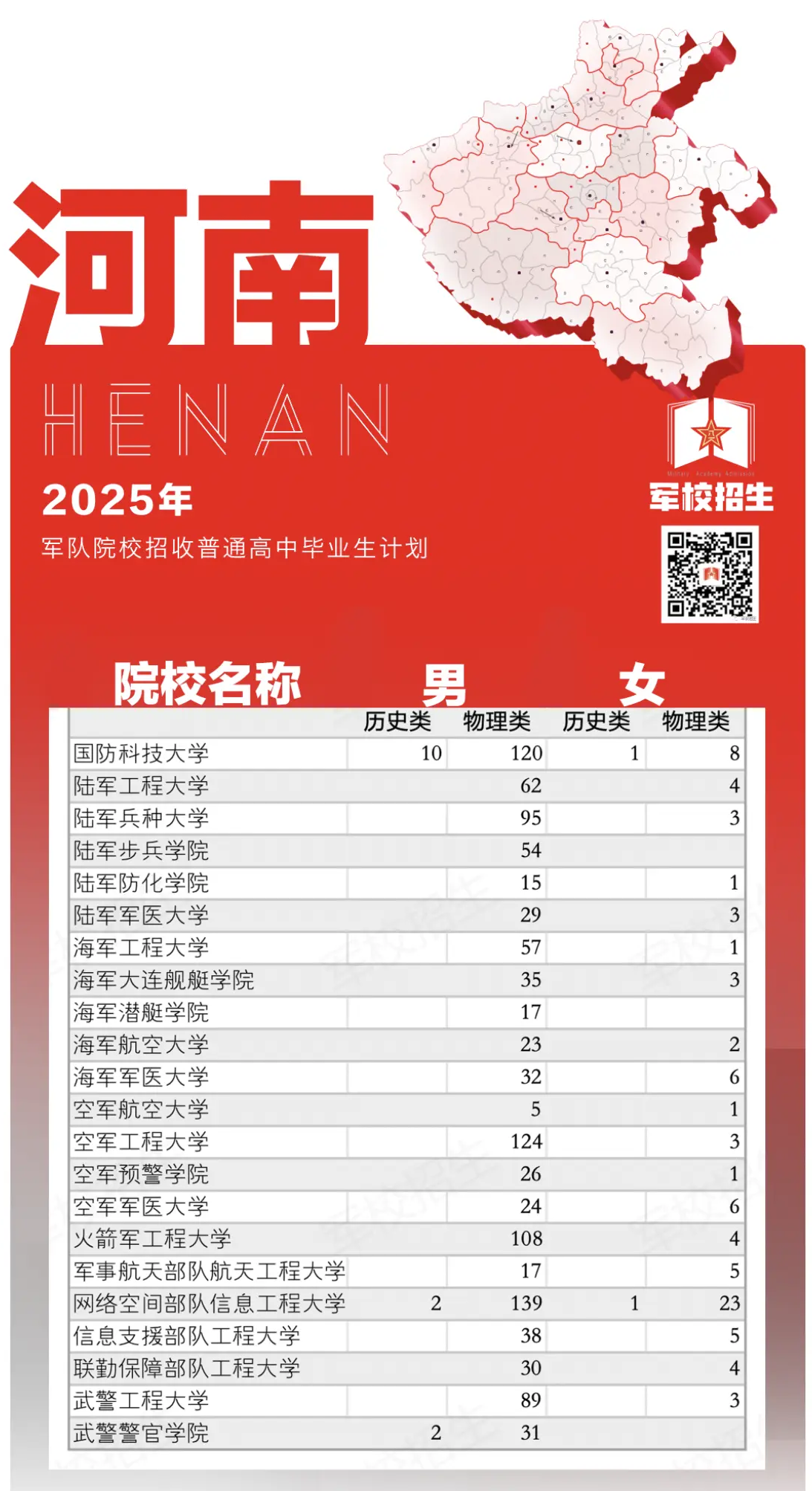 目前军校招生网已经公布了2025年全国所有军校在河南的招生计划,2025年在河南招生的军校共有22所,共计招收1272人,女生88人、男生1184人。
