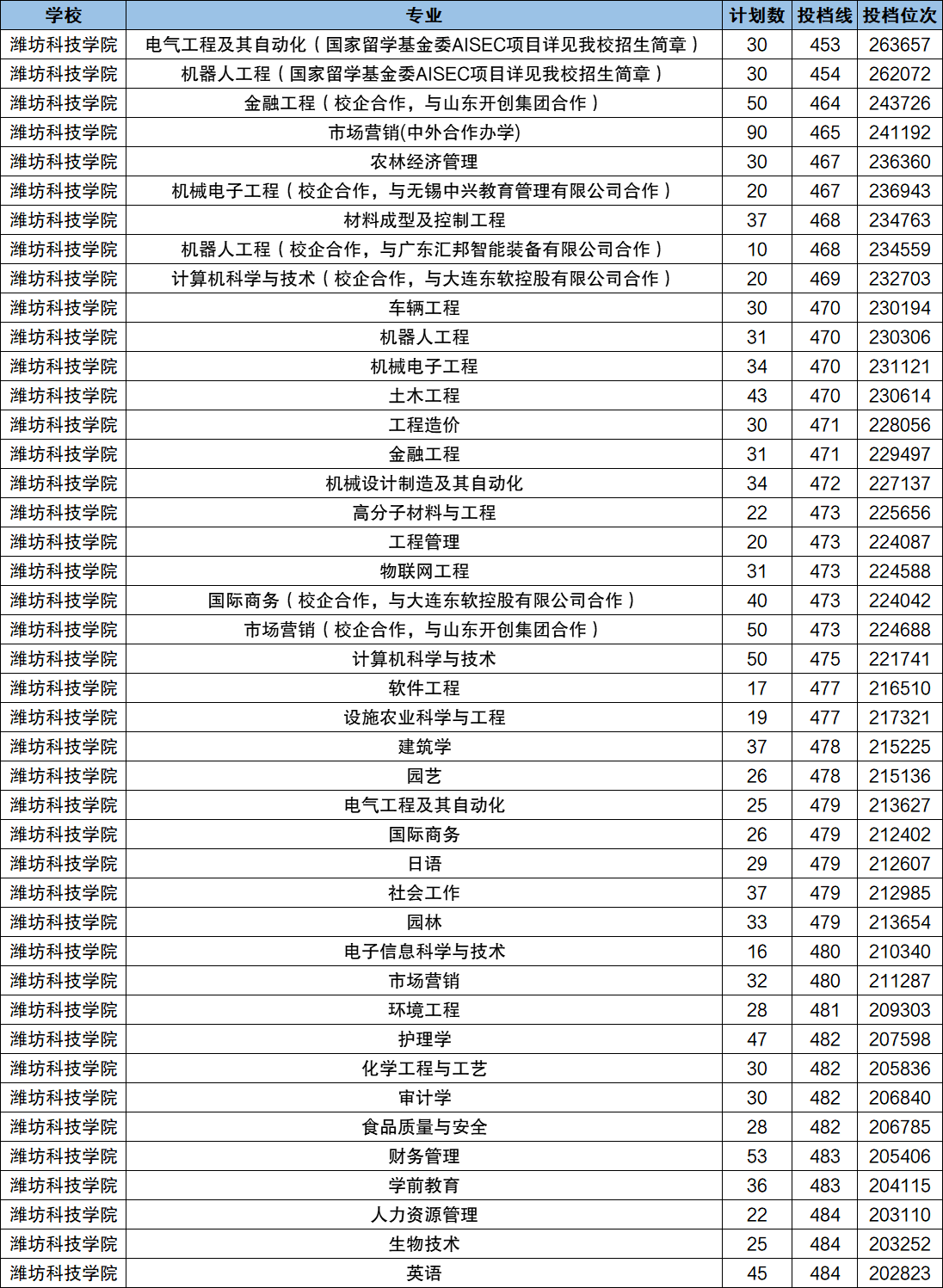 (1)潍坊科技学院(民办):453分;超一段线4分;