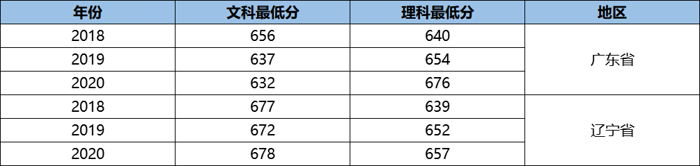 由下表可知,中国人民大学在广东省和辽宁省得录取分数都很高,基本上都大大超过当地省控线。