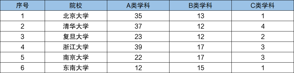 从第四轮学科评估结果看,东南大学有12个学科获得A等,有15个学科获得B等,有1个学科获得C等。该成绩单独看来十分耀眼,足以傲视国内其他高校,但是与清华大学、北京大学、复旦大学等顶尖985高校相比却是相形见绌。从下表可知,在排名前5的985工程院高校中,其所拥有的A类学科都超过20个,A等、B等、C等学科的总数亦超过30个,可见在学科水平中,东南大学距顶尖985高校仍有不小的差距。