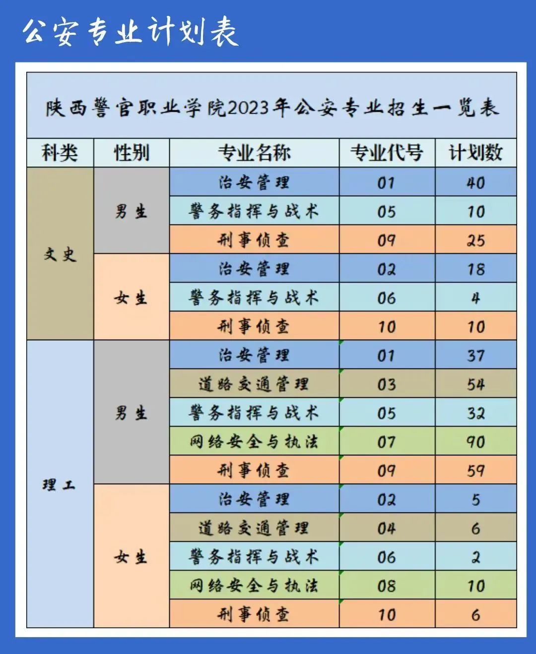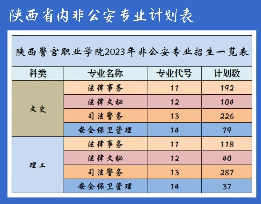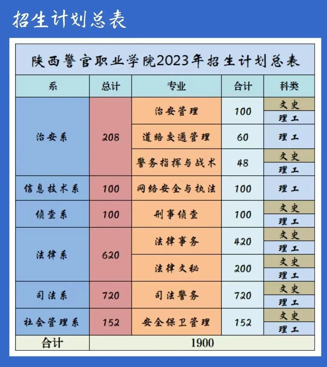 陕西警官职业学院2023年招生计划共1900人。其中,公安专业招生计划408人,非公安专业招生计划1492人;陕西省内招生计划1568人,省外招生计划332人。国标代码:13819,在陕招生代码:8118。