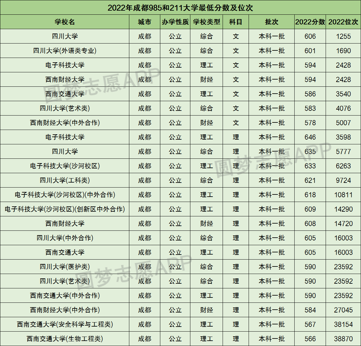 根据圆梦志愿APP提供的数据,小编为大家整理出了成都市内的985大学和211大学在成都市文理科的最低分数线及近一年的录取位次。