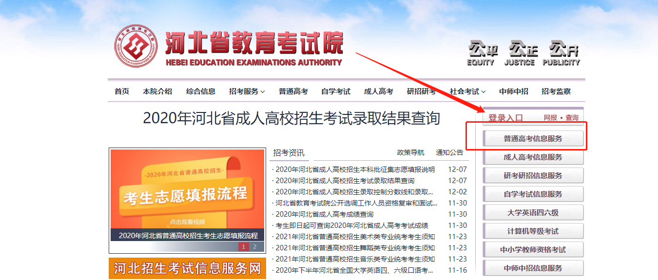 登录河北省教育考试院(https://gk.hebeea.edu.cn/hebgk/),点击页面右侧的“普通高考信息服务”即可。