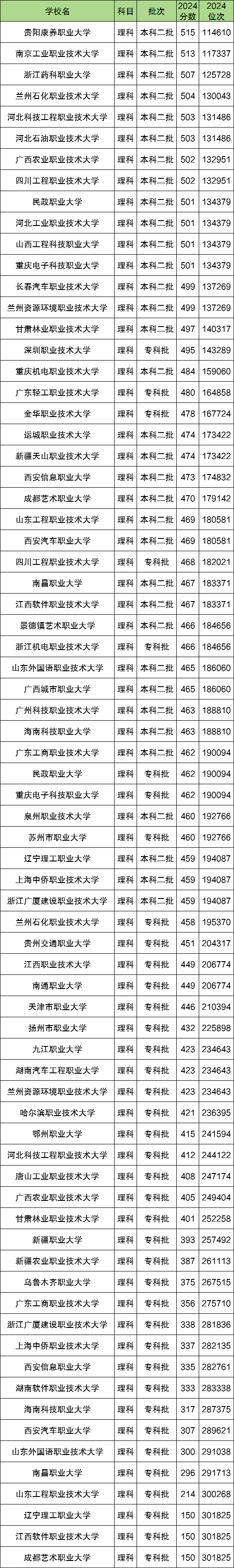 下面是2024年各职业本科大学在四川省理科的录取分数线: