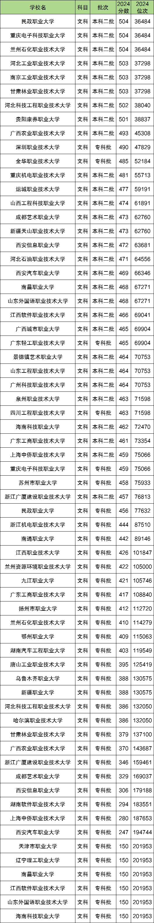 2024年职业本科大学在四川省文科录取中,收分最高的大学有民政职业大学、重庆电子科技职业大学、兰州石化职业技术大学,2024年最低分为504分,最低位次为36484名。