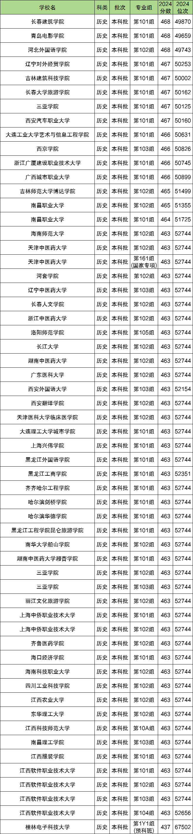 下面是历史类考生最好考的50所本科批院校排名榜单一览表,分数线从437分到468分,历史类考生全省排名在49870名-67502名之间能上这些大学。