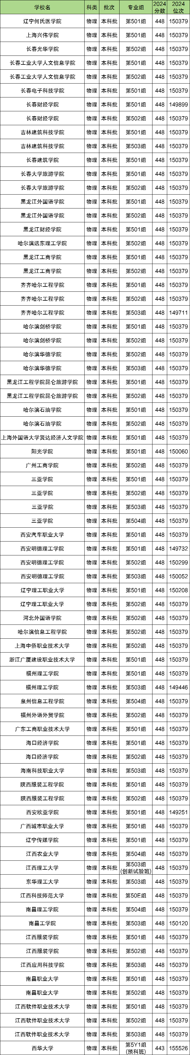 下面是物理类考生最好考的50所本科批院校排名榜单一览表,分数线从443分到448分,物理类考生全省排名在150379名-155526名之间能上这些大学。