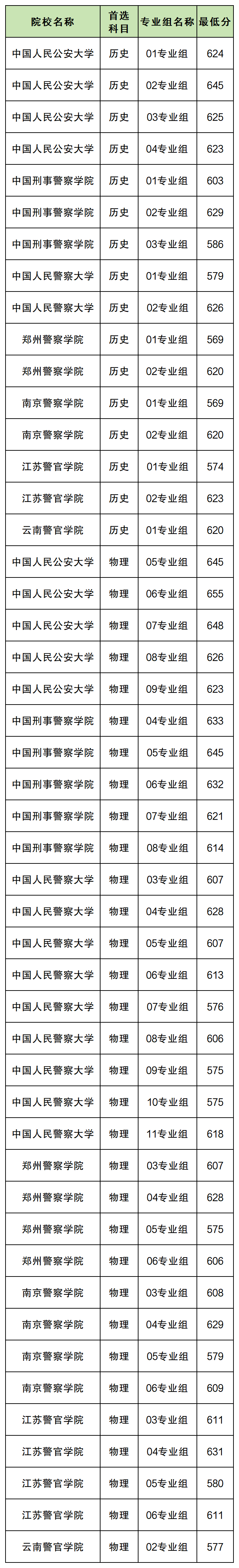 物理类:最低575分,对应中国人民警察大学09组和10组、郑州警察学院05组。