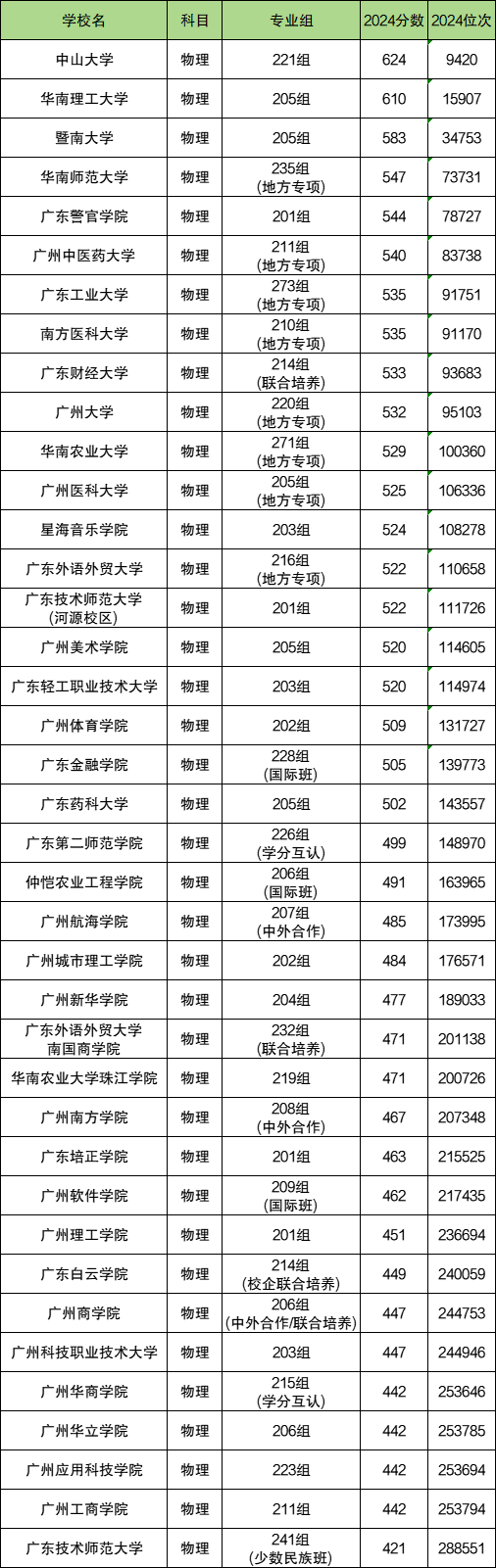 在广州高考物理组中,中山大学的录取分数最高,2024年分数为624分,位次在9420名;广东技术师范大学是录取分数最低的本科大学,2024年分数为421分,招生为241组(少数民族班),位次在288551名。