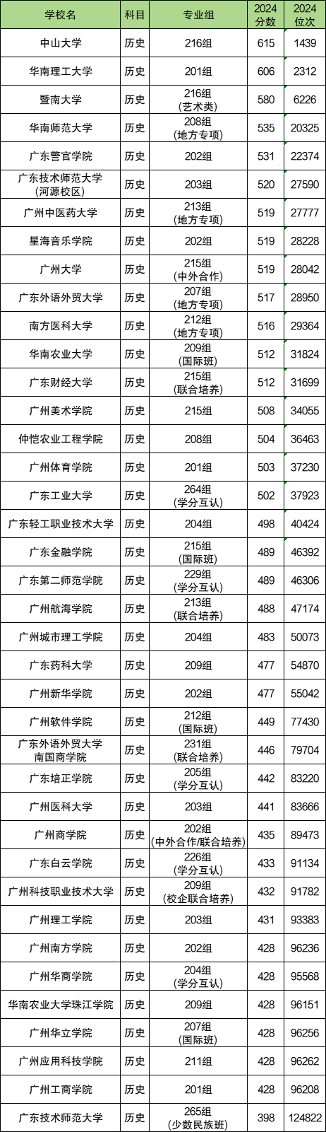 在广州高考历史组中,中山大学的录取分数最高,2024年分数为615分,位次在1439名;广东技术师范大学是录取分数最低的本科大学,2024年分数为398分,招生为265组(少数民族班),位次在124822名。