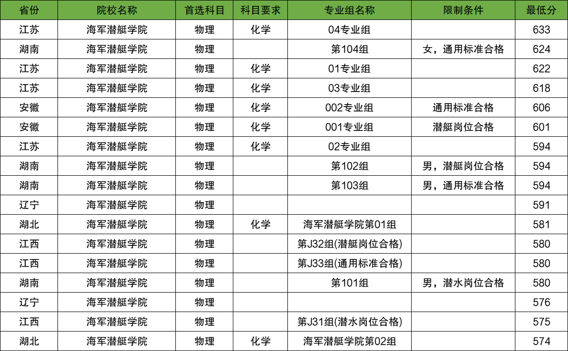 2025年海军潜艇学院提前批录取分数线是574分到633分,录取最低在湖北物理类、录取最高在江苏物理类。