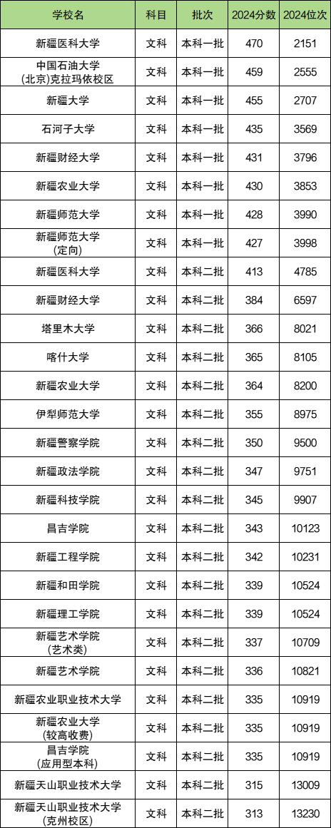2024年新疆高考文科录取分数最高的本科院校依次是新疆医科大学470分、中国石油大学(北京)克拉玛依校区459分、新疆大学455分;录取分数最低的三所本科院校是新疆天山职业技术大学(克州校区)313分、新疆天山职业技术大学315分、昌吉学院(应用型本科)335分。