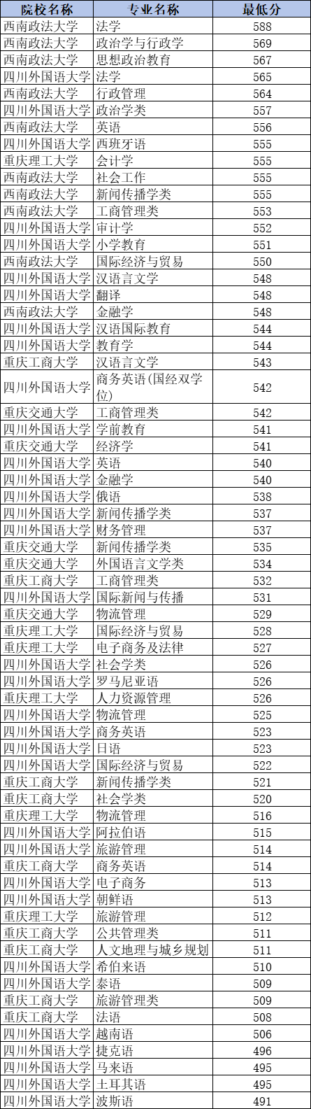 2024年地方专项计划各大学在重庆历史类分数线最低、最易考的一所院校及专业为:四川外国语大学马来语(495分)、四川外国语大学土耳其语(495分)、四川外国语大学波斯语(491分)。