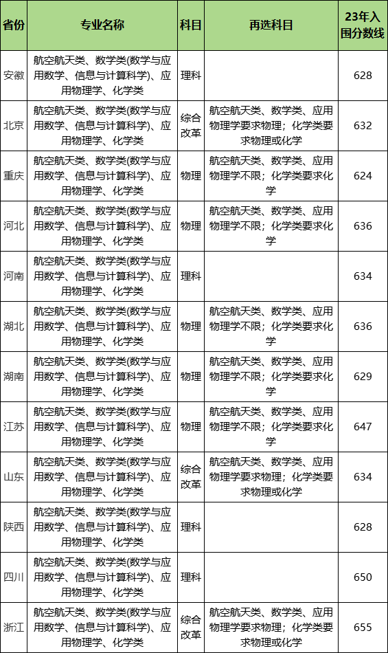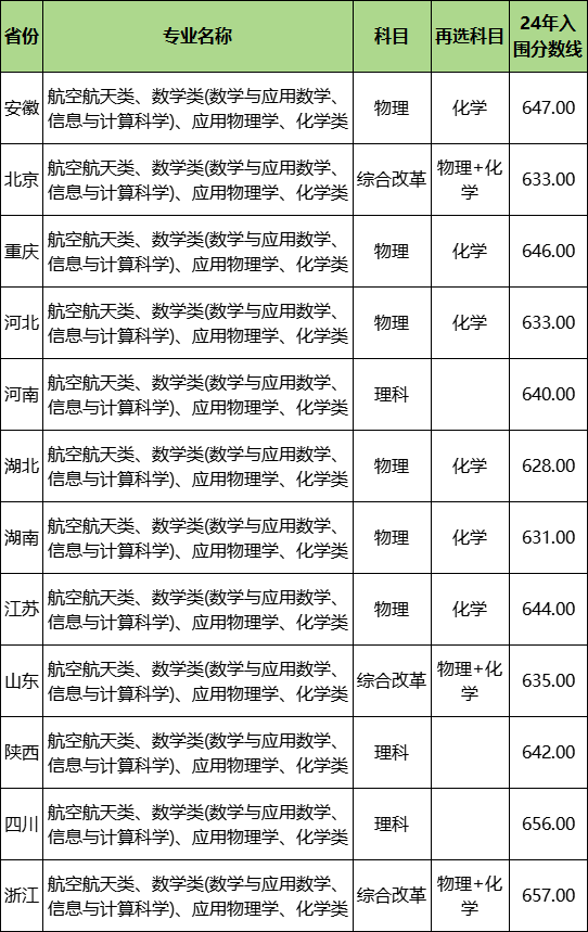 安徽:航空航天类、数学类(数学与应用数学、信息与计算科学)、应用物理学、化学类647分;