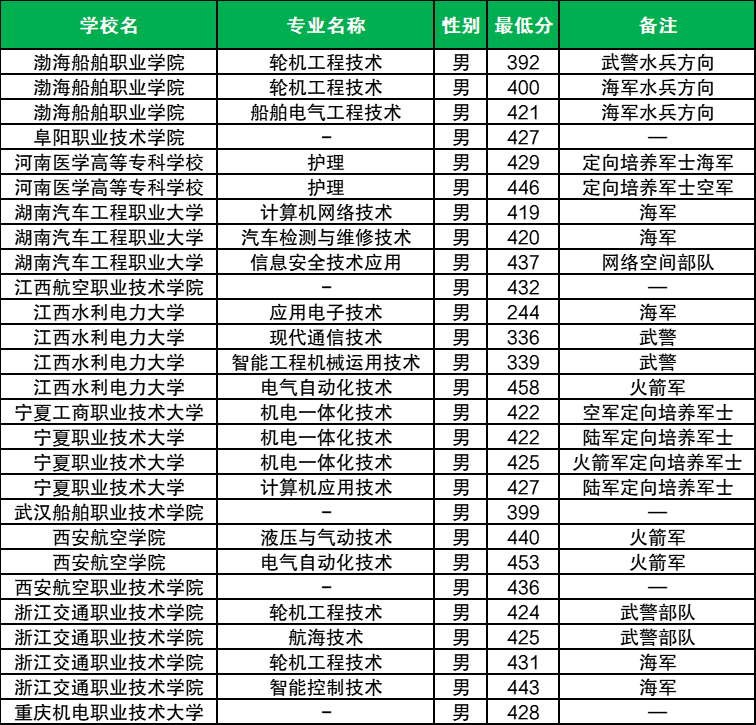 最低分392分,最低分专业是轮机工程技术(男、武警水兵方向);