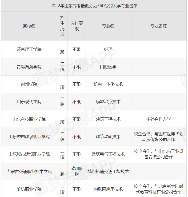 2022年山东省还有这些学校的部分专业录取分数线为360分: