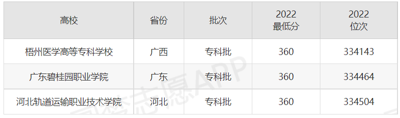 2022年广东物理类录取分数线360的大学有3所,分别是:梧州医学高等专科学校、广东碧桂园职业学院、河北轨道运输职业技术学院。