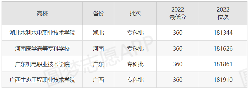 2022年广东历史类录取分数线360的大学有3所,分别是:湖北水利水电职业技术学院、河南医学高等专科学校、广东机电职业技术学院、广西生态工程职业技术学院。