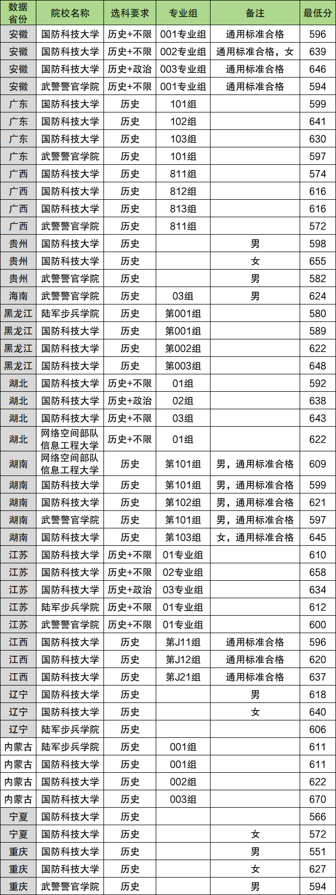 下面是2025年全国文科/历史组军校录取分数线排名一览表(全国各地汇总):