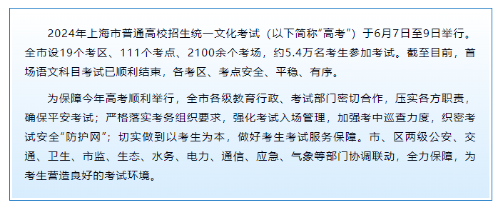2022年上海市高考报名人数5万人,与往年基本持平,从全年来看,上海高考考生人数约7万人,其中,有部分考生通过春考、专科自主招生被录取,还有一部分考生将在7月11-12日参加三校生高考。