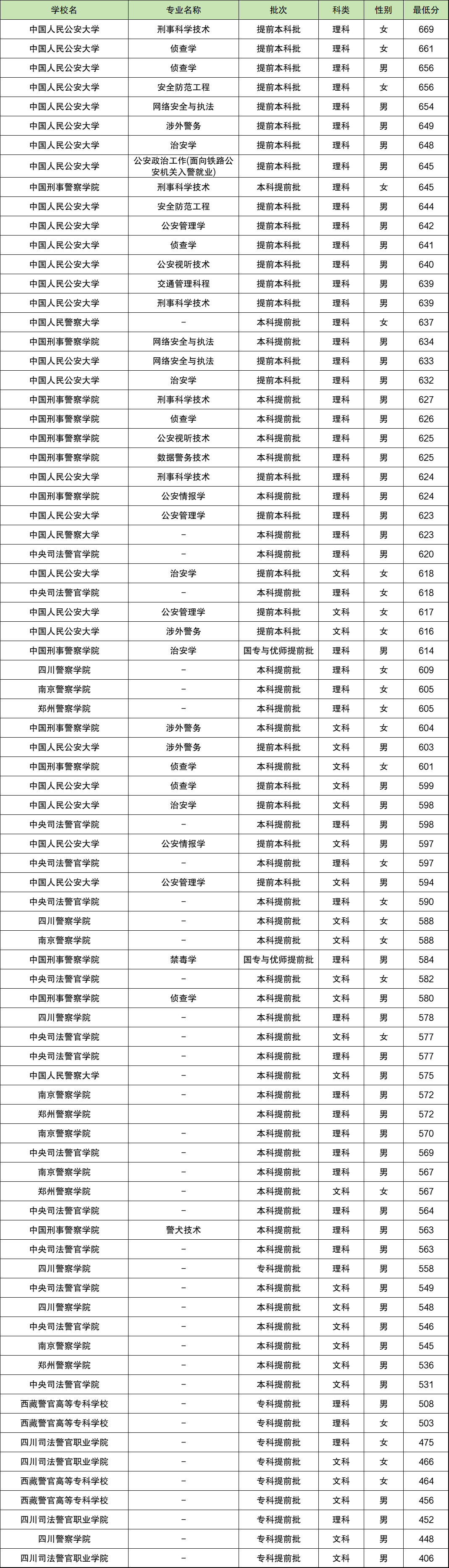 最低录取分数线为:男生406分、女生464分,招生院校分别是四川司法警官职业学院和西藏警官高等专科学校;
