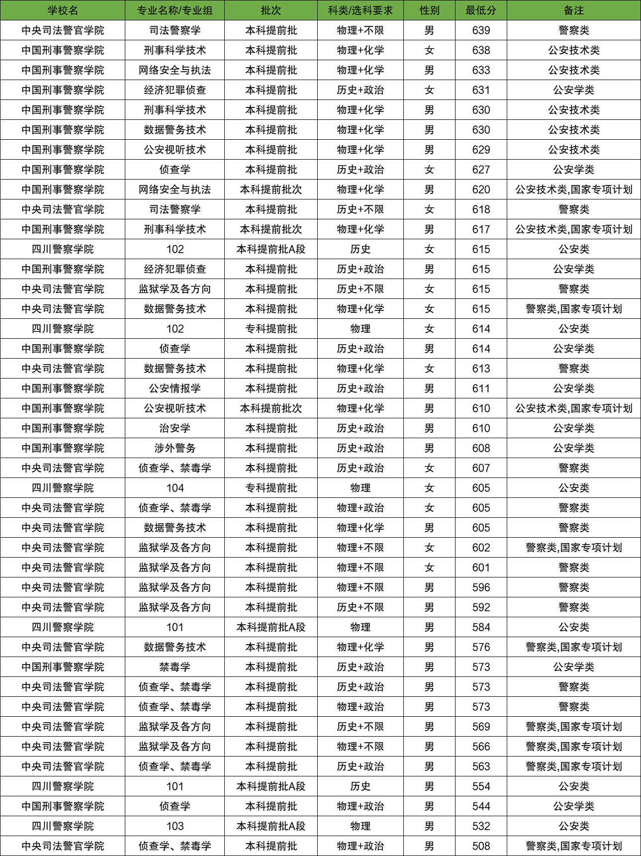 四川本科提前批和专科提前批全国警校的最低录取分数线如下: