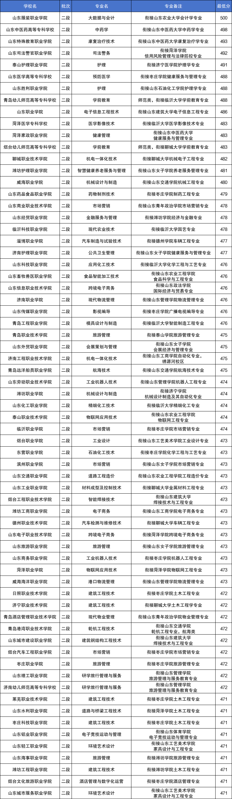 2024年山东3+2专本贯通学校录取分数线及位次最高是山东服装职业学院大数据与会计专业,2024年录取最低分为500分,衔接本科院校为山东工艺美术学院家具设计与工程专业。