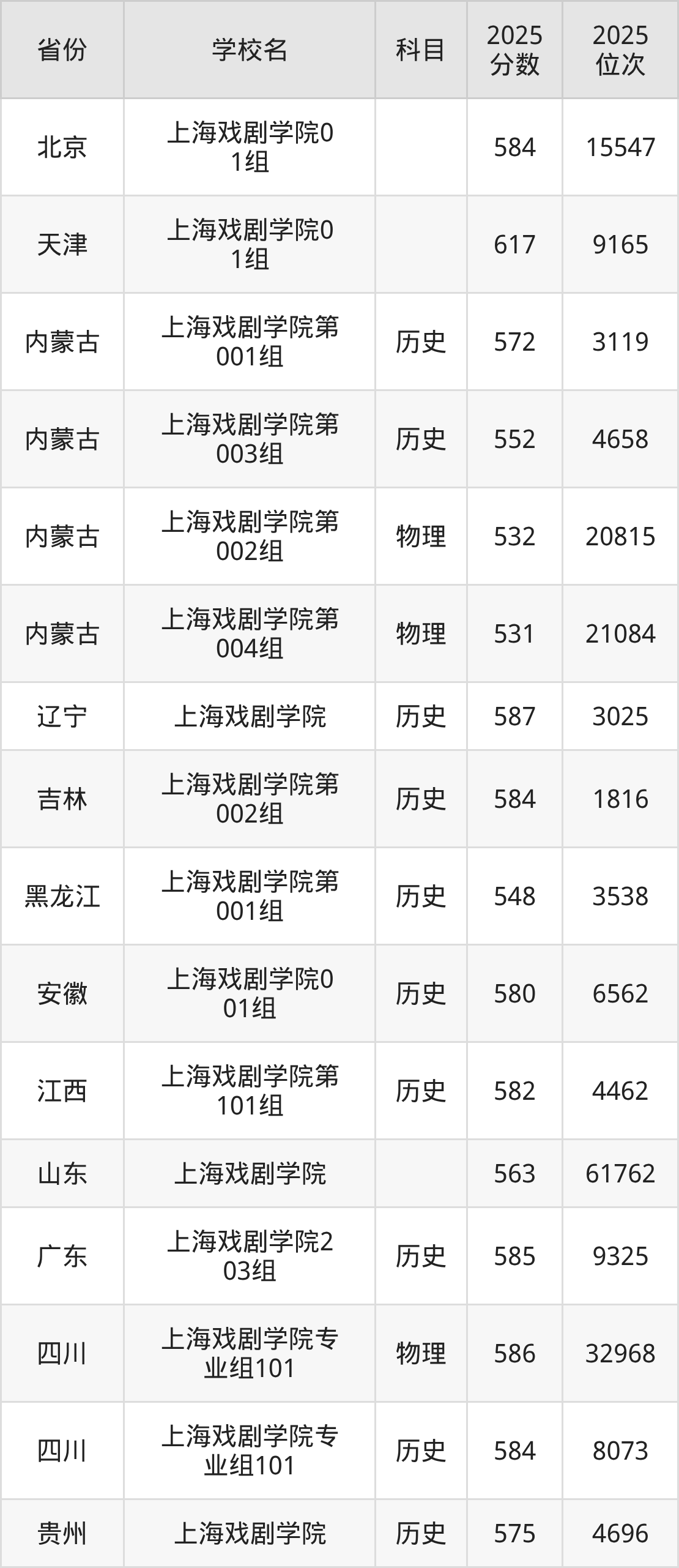 2026年上海戏剧学院录取分数线预计在560分及以上,在各省录取最低分存在一定差异,如:2025年上海戏剧学院在北京录取最低分是584分,在天津录取最低分是617分,在吉林录取最低历史类584分。