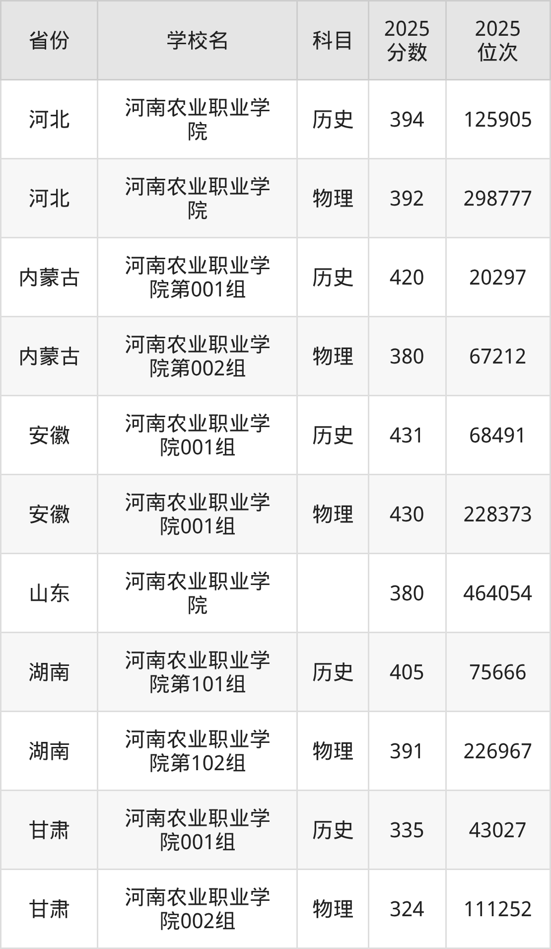 2025年河南农业职业学院历史类最低分394分(125905名)、物理类最低分392分(298777名)。