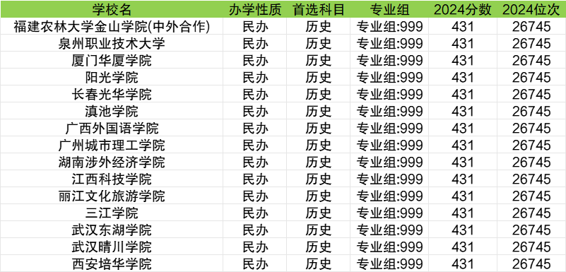 历史类本科线最低的综合类大学是西安培华学院999专业组、武汉晴川学院999专业组、武汉东湖学院999专业组等,2024年最低分为431分,刚好为本科线分数,对应最低位次为26745名。
