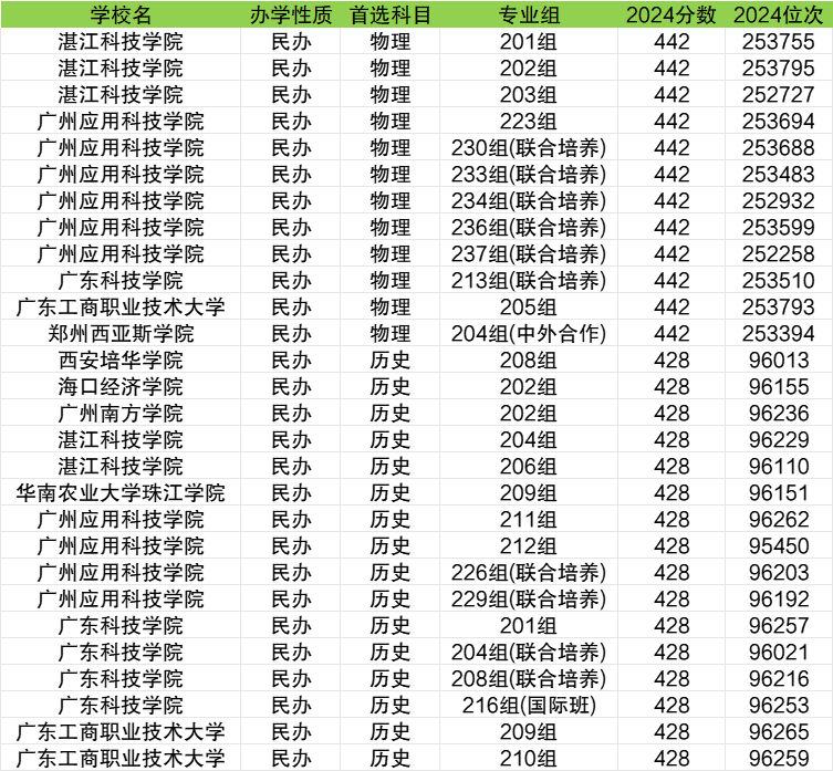 历史类本科线最低的综合类大学是广东工商职业技术大学210专业组、广东工商职业技术大学209专业组、广东科技学院216专业组(国际班)等,2024年最低分为428分,刚好为本科线分数。