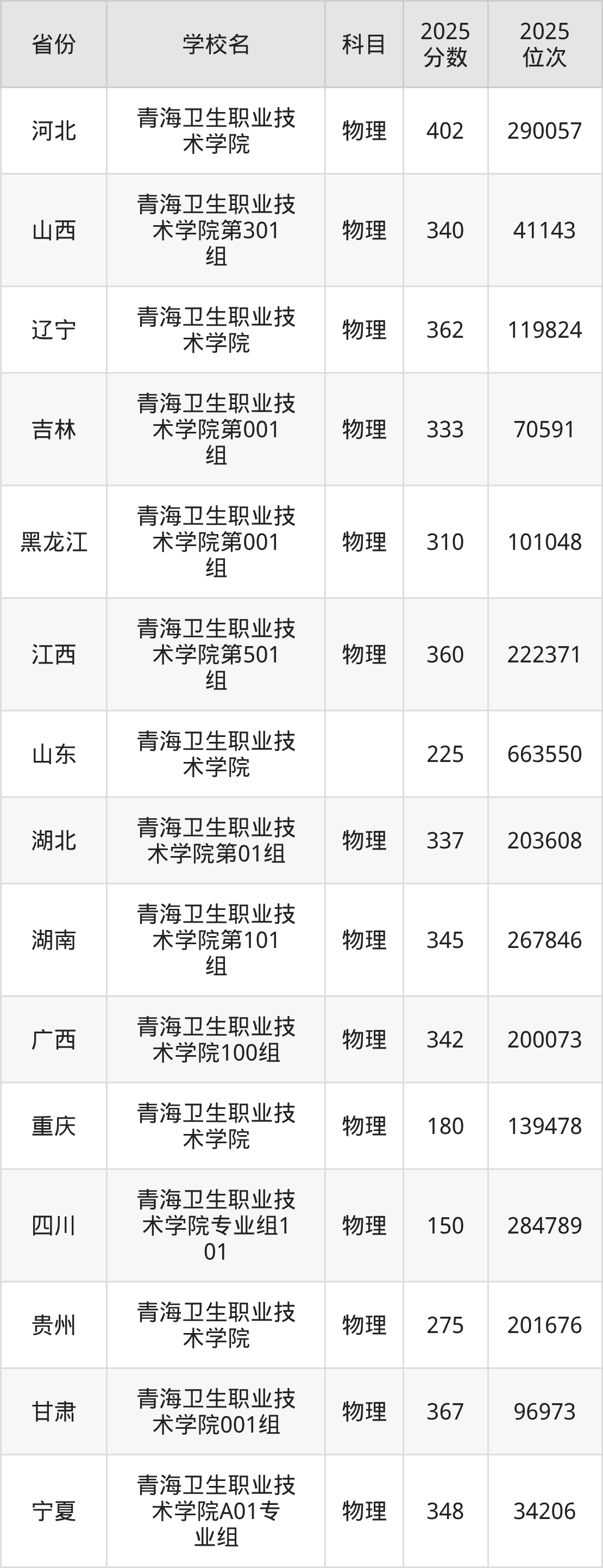 2026年青海卫生职业技术学院录取分数线预计在310分及以上,在各省录取最低分存在一定差异,如:2025年青海卫生职业技术学院在贵州录取最低物理类275分,在江西录取最低物理类360分,在湖北录取最低物理类337分。