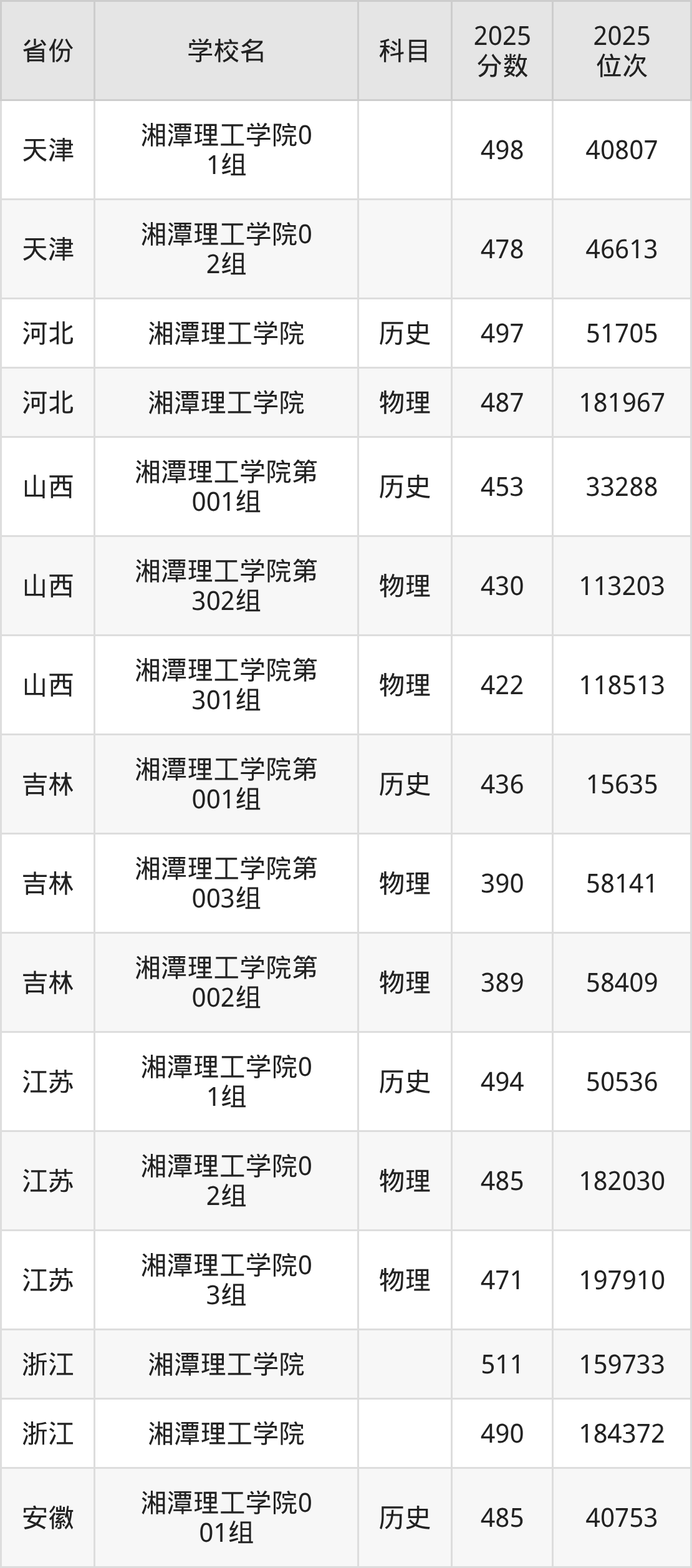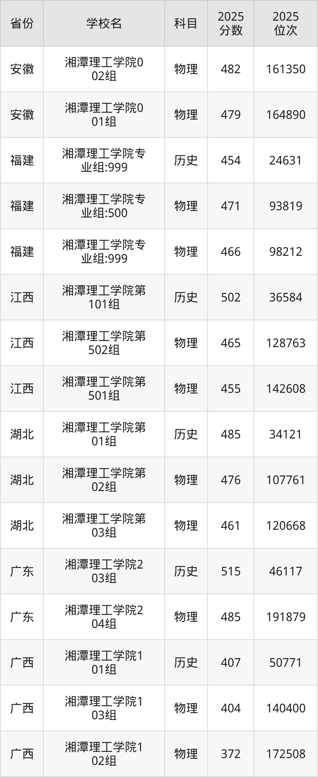 2025年湘潭理工学院历史类最低分462分(44697名)、物理类最低分424分(188046名)。