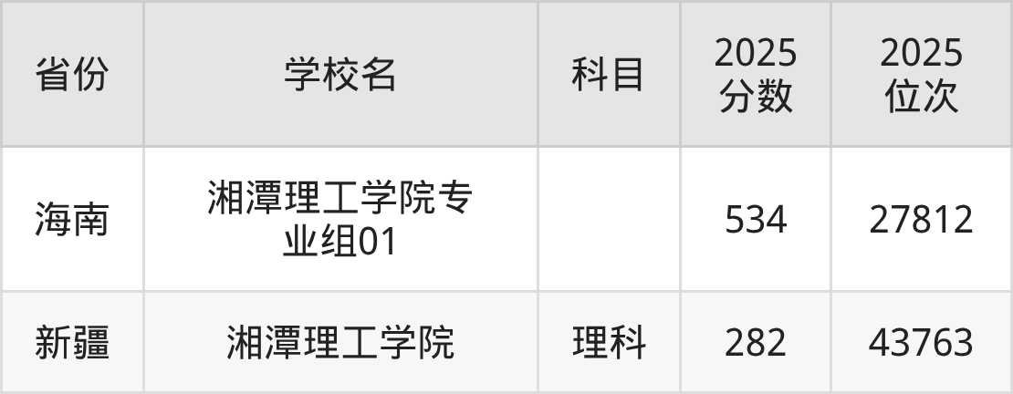 2025年湘潭理工学院在省外录取分数线范围整体位于282分到534分之间,录取分数线最低在新疆理科、录取分数线最高在海南(专业组01)。
