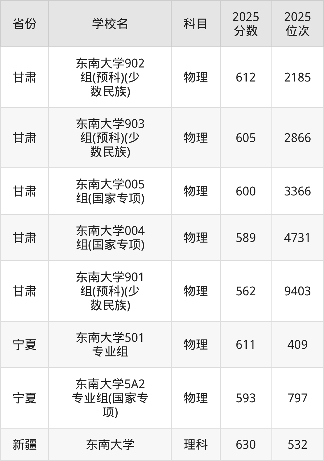 2025年东南大学在省外录取分数线范围整体位于562分到757分之间,录取分数线最低在甘肃物理(901组(预科)(少数民族))、录取分数线最高在海南(专业组02)。
