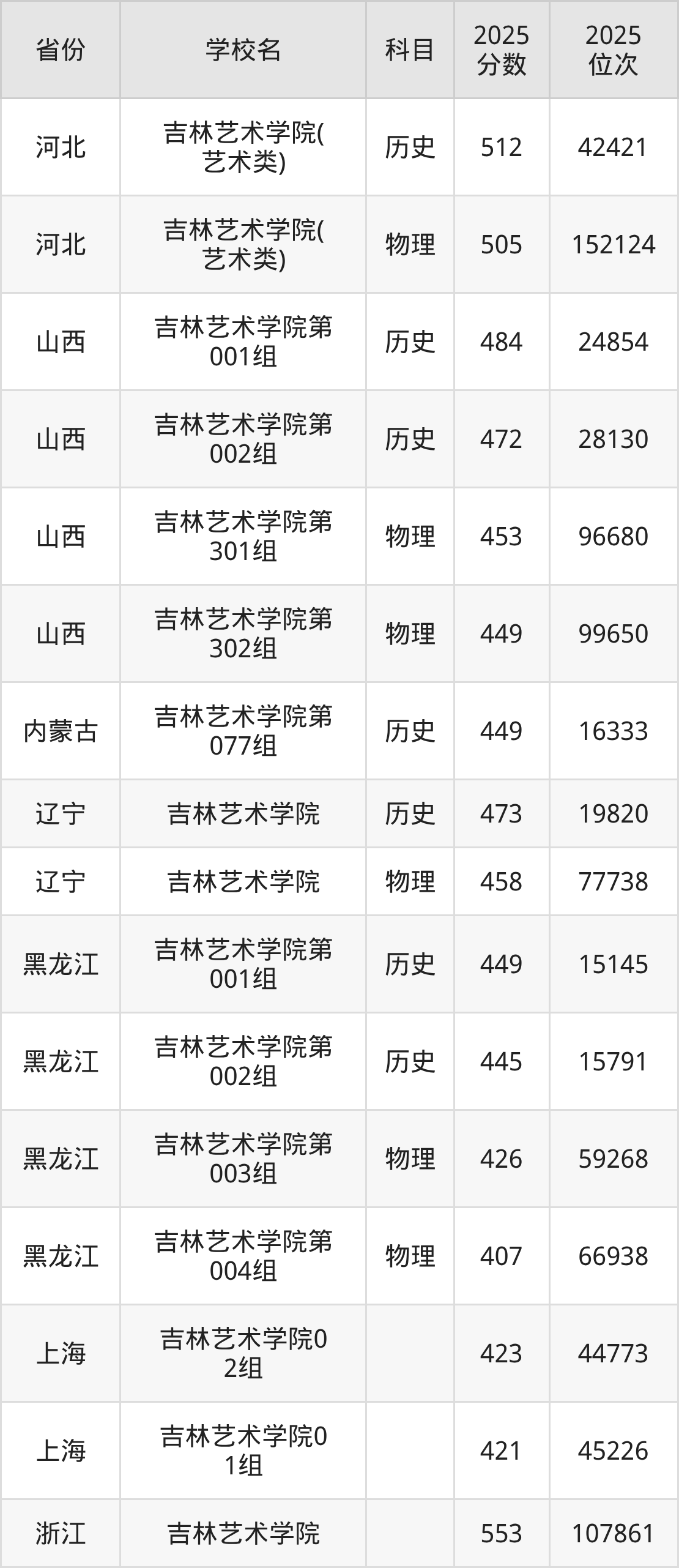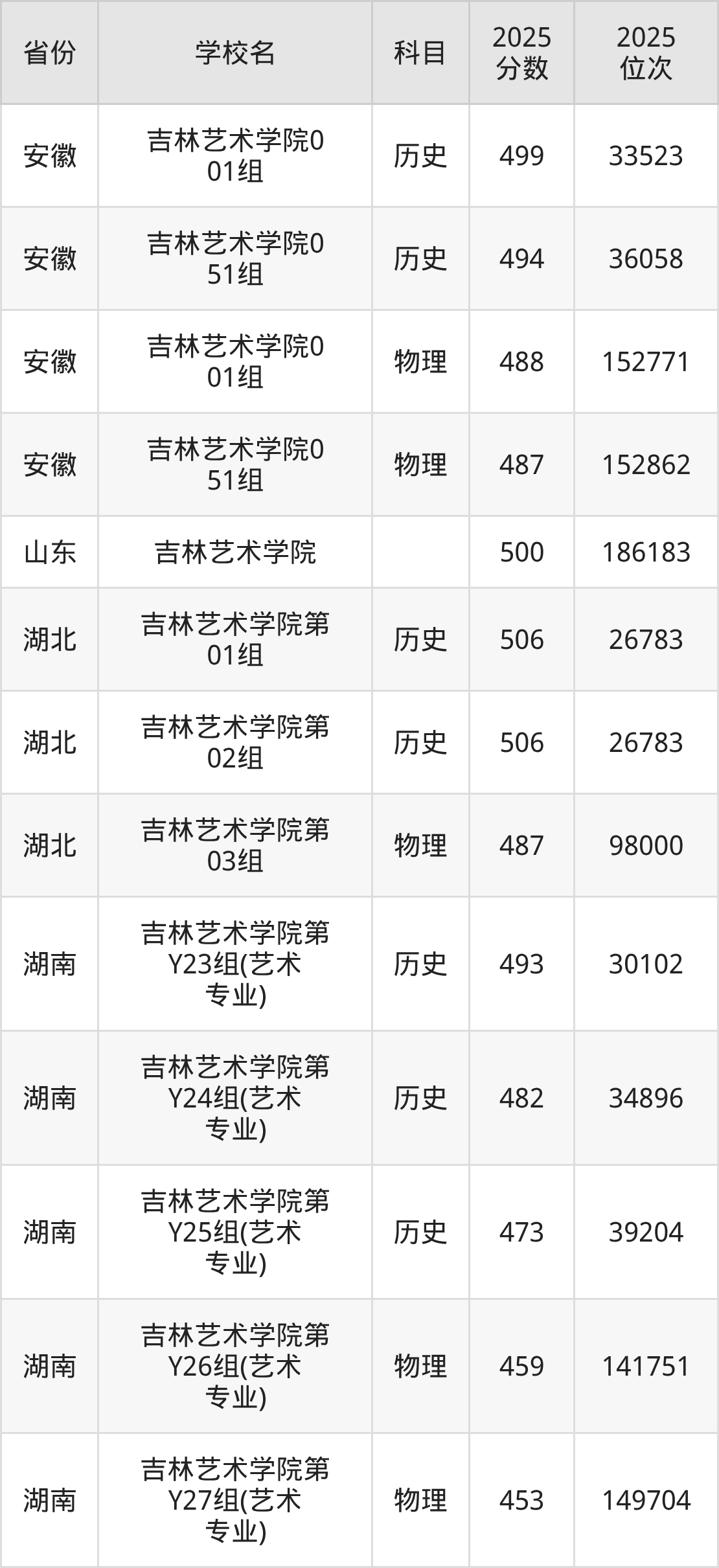 2025年吉林艺术学院历史类最低分459分(12791名)、物理类最低分409分(52906名)。