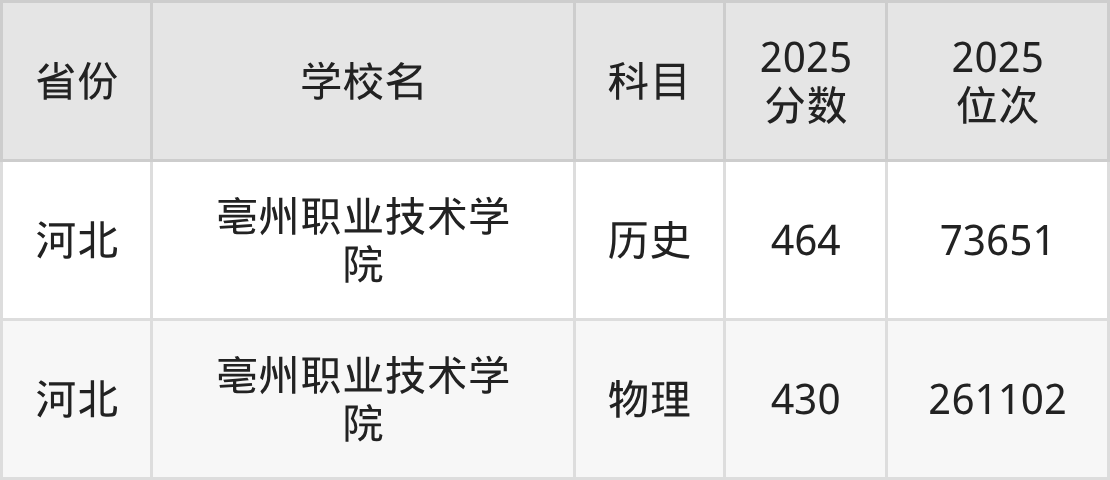 2025年亳州职业技术学院在省内分历史物理科目类录取,其中历史类最低分是382分、对应位次是93998名;物理类最低分是366分,对应位次是281452名。