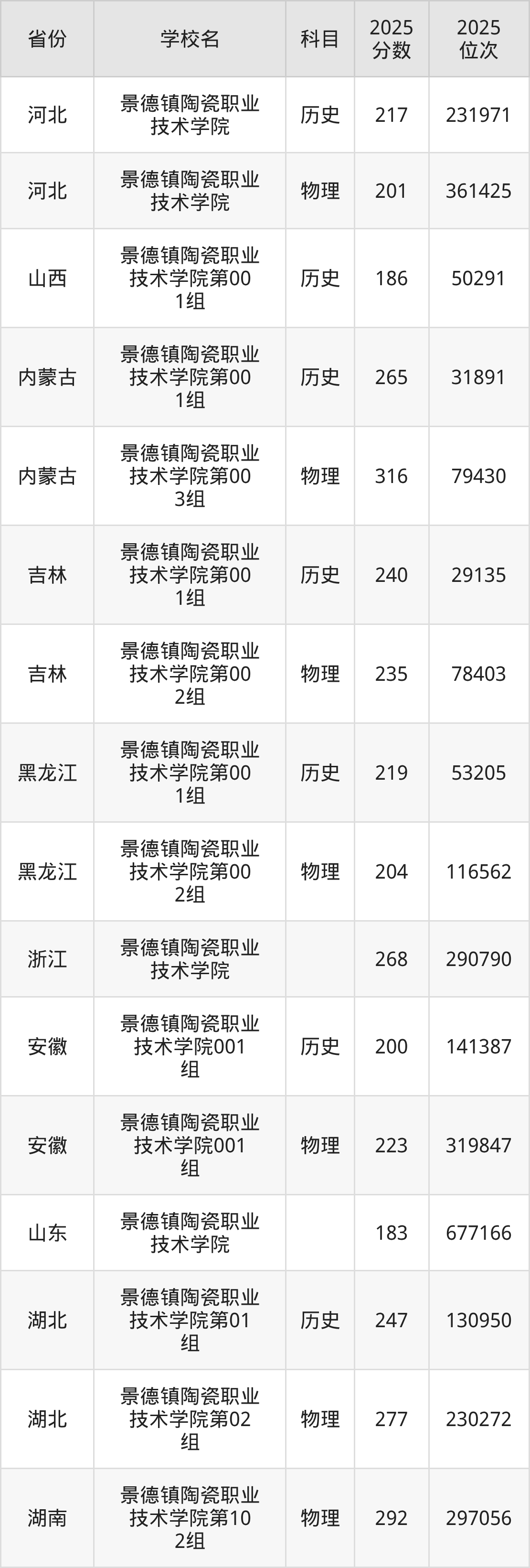 2025年景德镇陶瓷职业技术学院在省内分历史物理科目类录取,其中历史类最低分是335分、对应位次是150960名;物理类最低分是240分,对应位次是259802名。