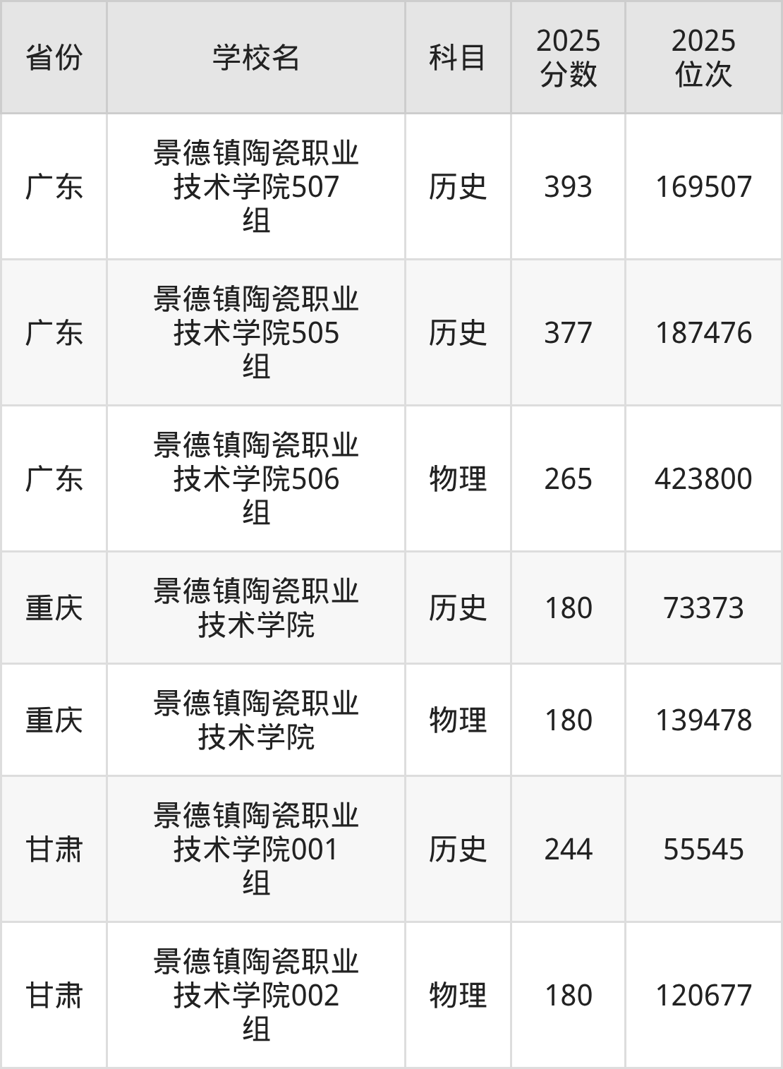2026年景德镇陶瓷职业技术学院录取分数线预计在240分及以上,在各省录取最低分存在一定差异,如:2025年景德镇陶瓷职业技术学院在江西录取最低历史类335分、物理类240分,在广东录取最低历史类377分、物理类265分,在甘肃录取最低历史类244分、物理类180分。