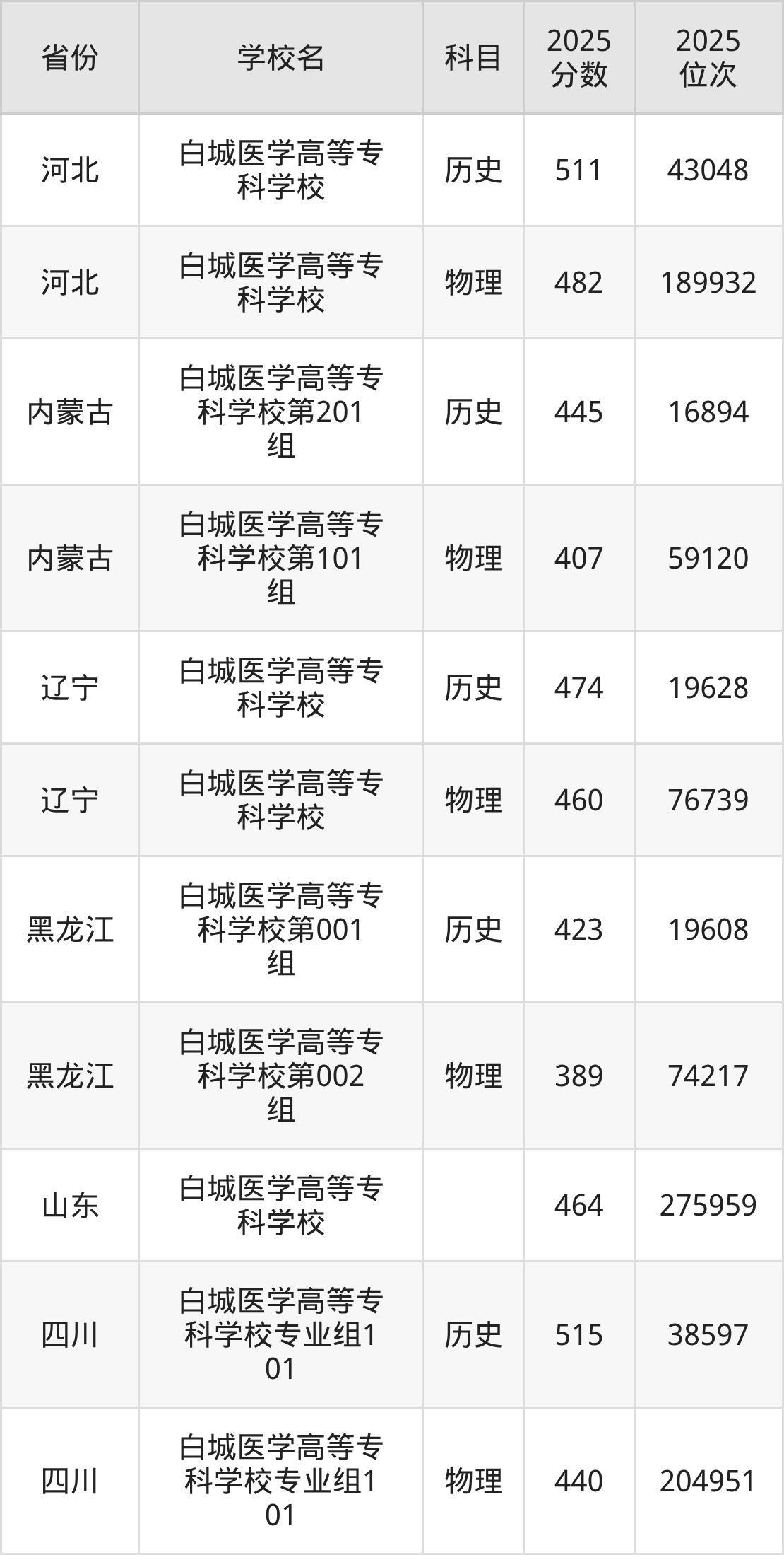 2025年白城医学高等专科学校历史类最低分360分(23879名)、物理类最低分310分(73864名)。