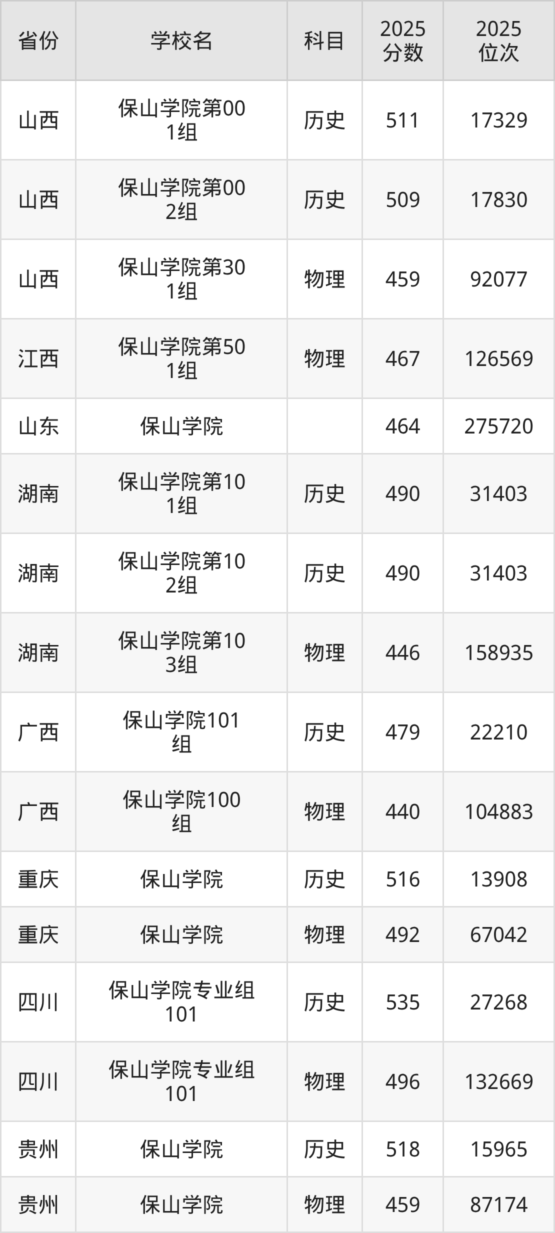 2025年保山学院在省外录取分数线范围整体位于440分到535分之间,录取分数线最低在广西物理(100组)、录取分数线最高在四川历史(专业组101)。